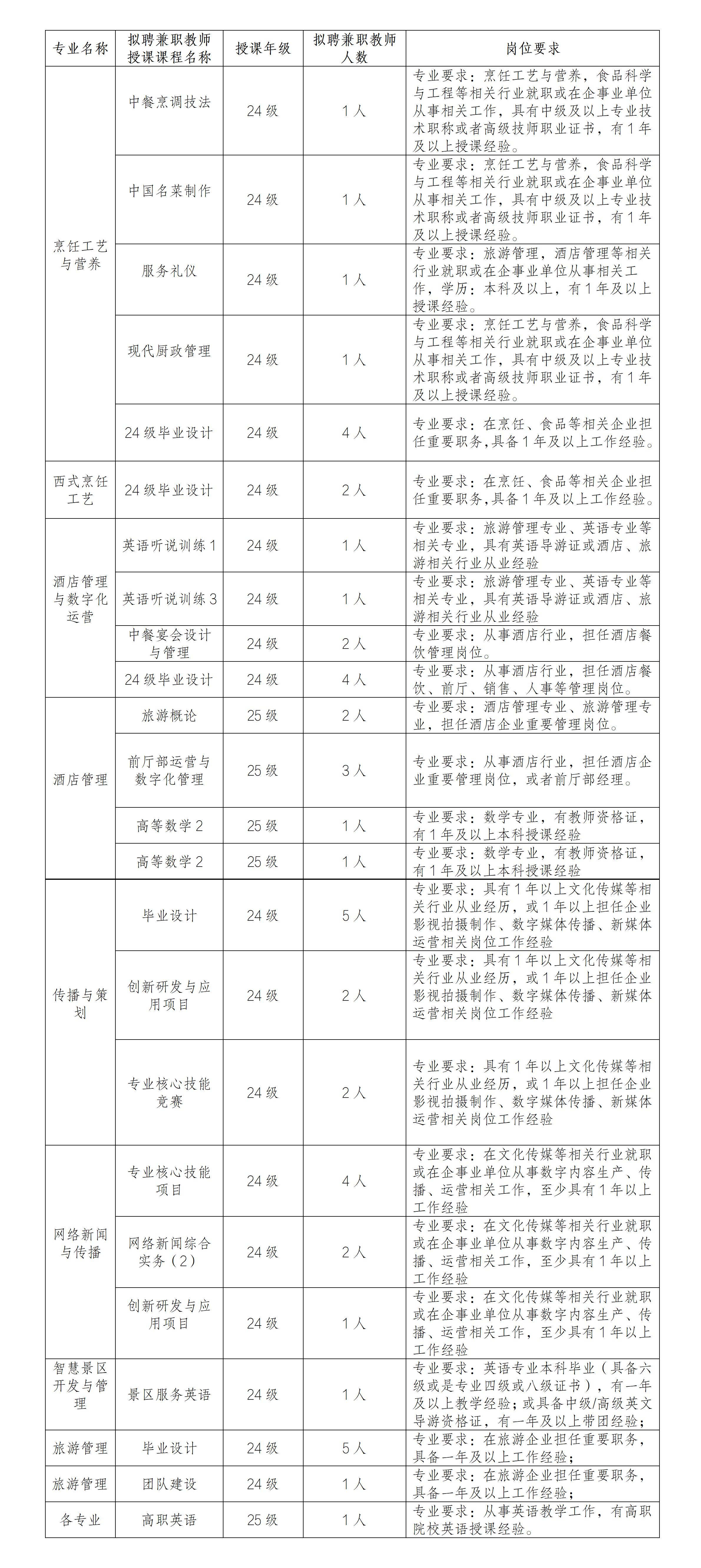 本次招聘兼职教师是指来自行业企业一线,符合学校人才培养所需的,具有相应行业资格或职称(职业技能等级)等的专业技术人员,参与我院2026年春学期专业课教学及实践实训指导工作,详见下表: