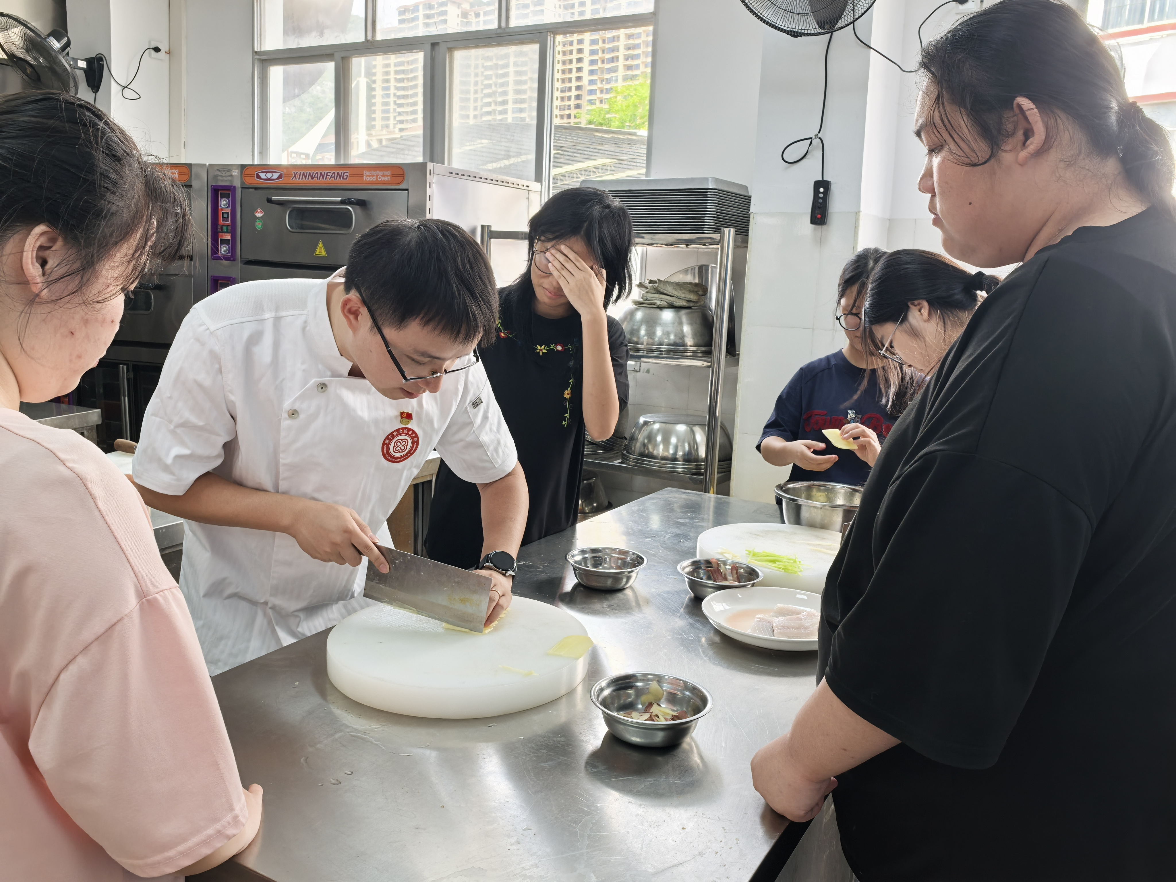 为助力马山县民族职业技术学校烹饪专业师生提升技能竞赛水平,充分发挥高校烹饪专业的示范引领作用,10 月 14 日,南宁职业技术大学文化与旅游学院烹饪工艺与营养专业团队带头人李河、专任教师曾璐璐赴该校开展中餐烹饪示范课及技能竞赛指导活动,以“菊花鱼”“清炒土豆丝” 为载体,为马山职校师生带来了一场兼具专业性与实用性的烹饪技能盛宴。