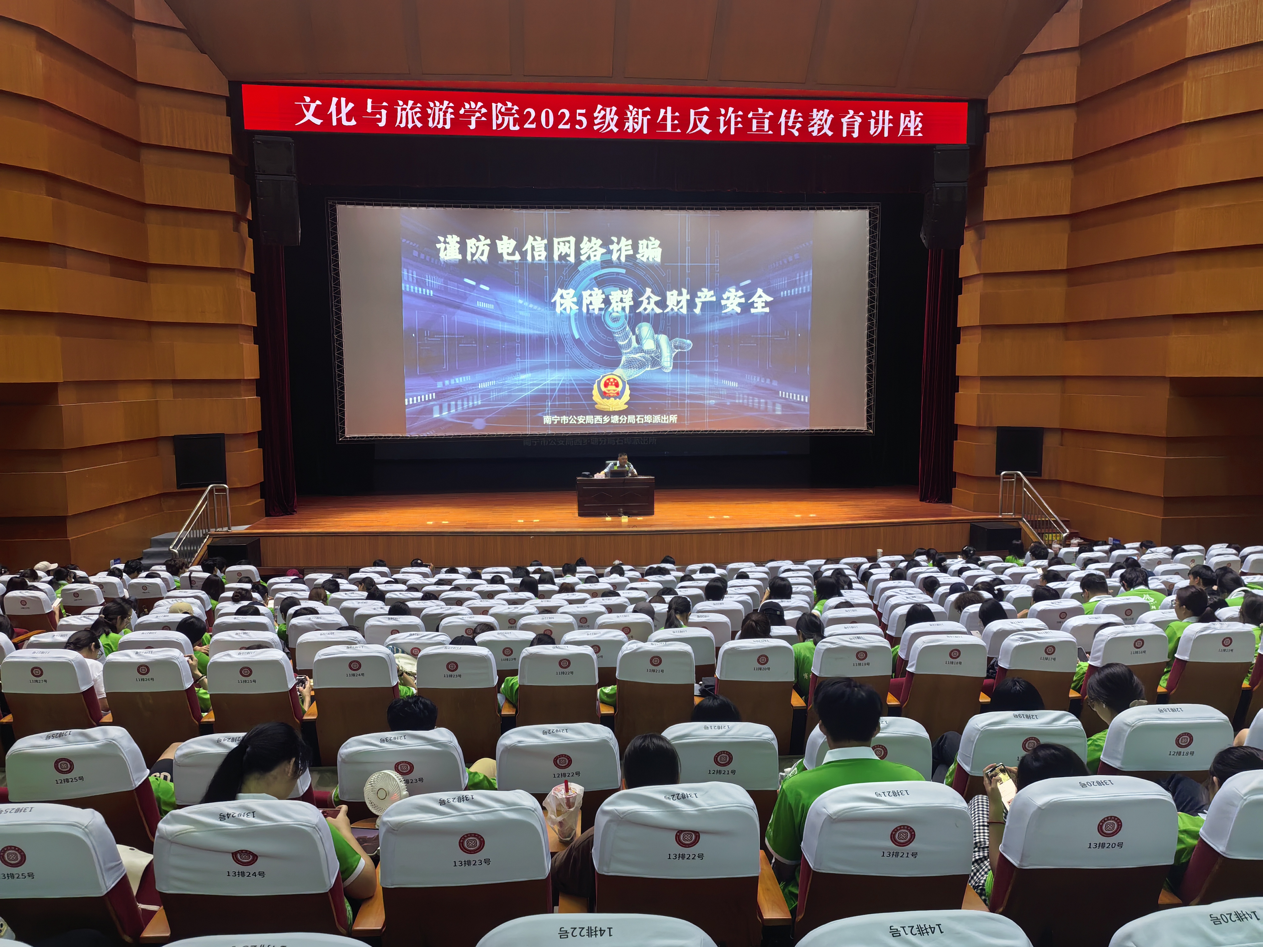 为提高学生防范网络电信诈骗意识。10月27日,学院在会议中心一号厅开展预防电信网络诈骗讲座。讲座由石埠派出所警官律光荣主讲,学院辅导员黄尚发主持,学院2025级新生参加讲座。