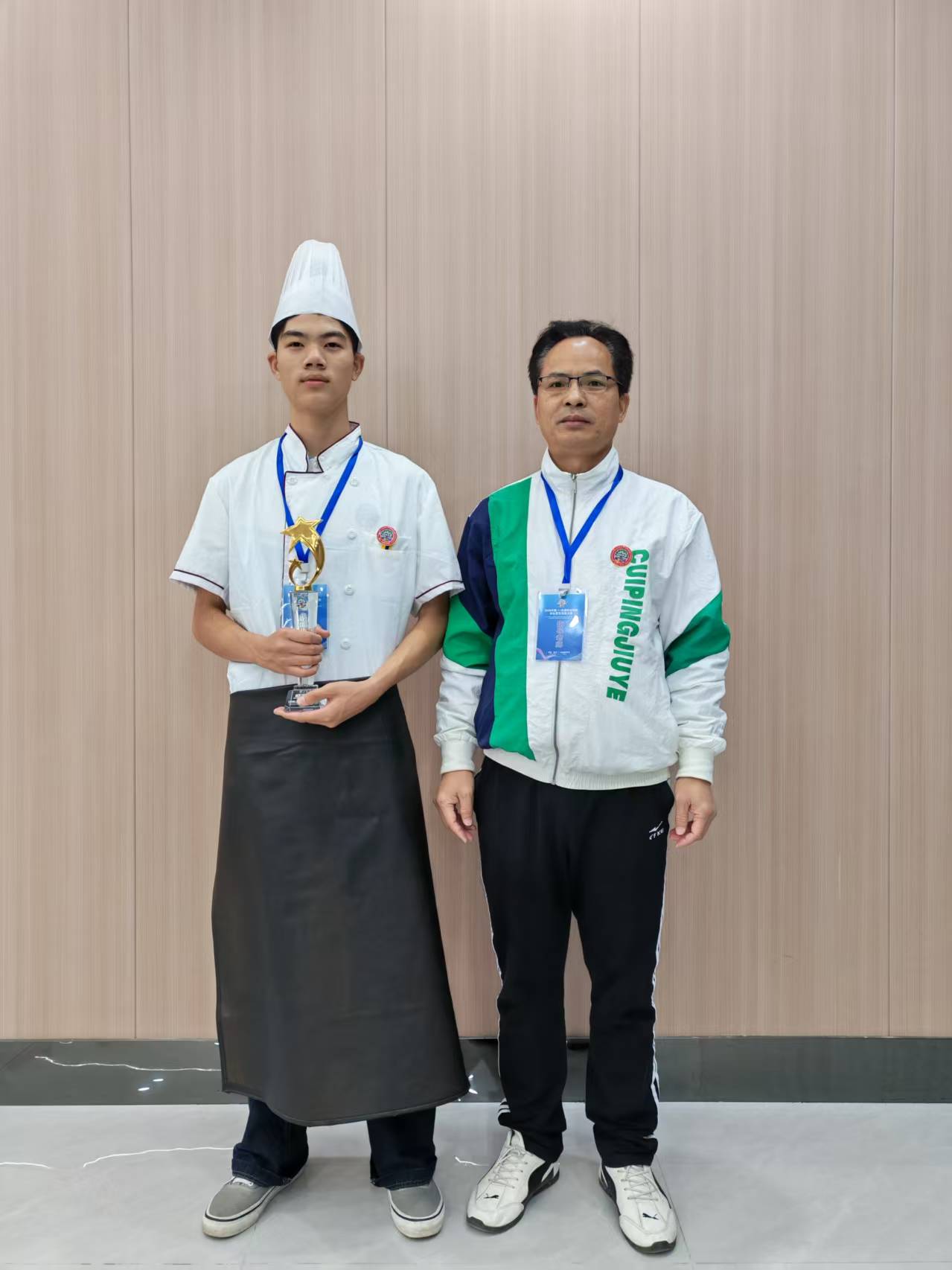 “最佳刀工奖”选手磨承歌(左)与指导老师合影(何明健/摄)