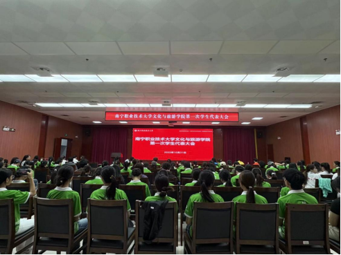 2025年10月31日,南宁职业技术大学文化与旅游学院第一次学生代表大会在学校会议中心三号厅召开,学院党委副书记黄全宾、校团委老师韦灿阳、学院团委学生会指导老师宁小玲出席会议,与来自学院各年级、各专业的150余名学生代表齐聚一堂,共同为学院学生工作的发展建言献策。