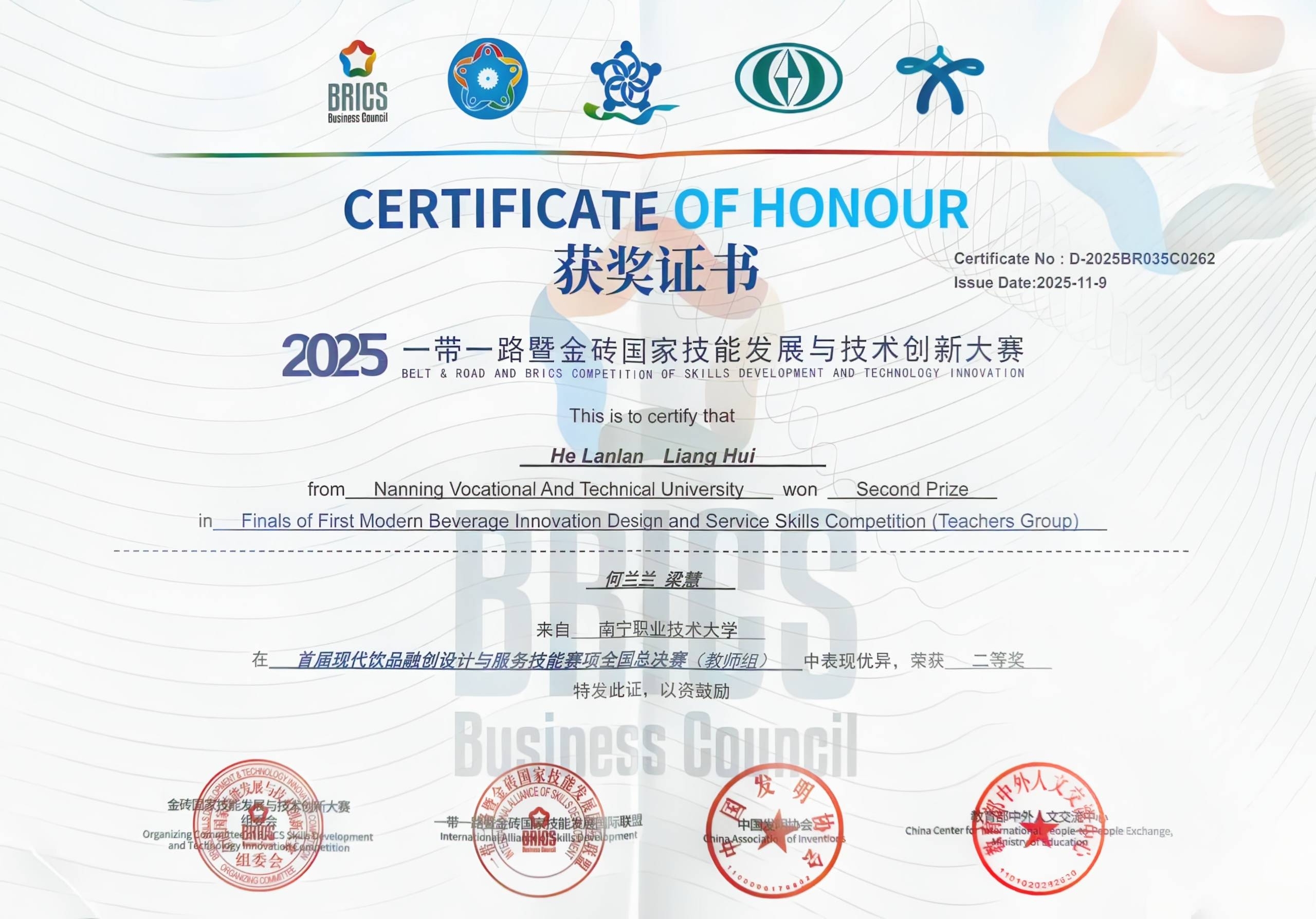 近日,2025“一带一路”暨金砖国家技能发展与技术创新大赛首届现代饮品融创设计与服务技能赛项总决赛(本科组、教师组、国际组)在成都圆满闭幕。酒店管理专业党员教师何兰兰、梁慧凭借扎实的专业功底与创新的服务理念,从众多参赛选手脱颖而出,最终荣获教师组二等奖。