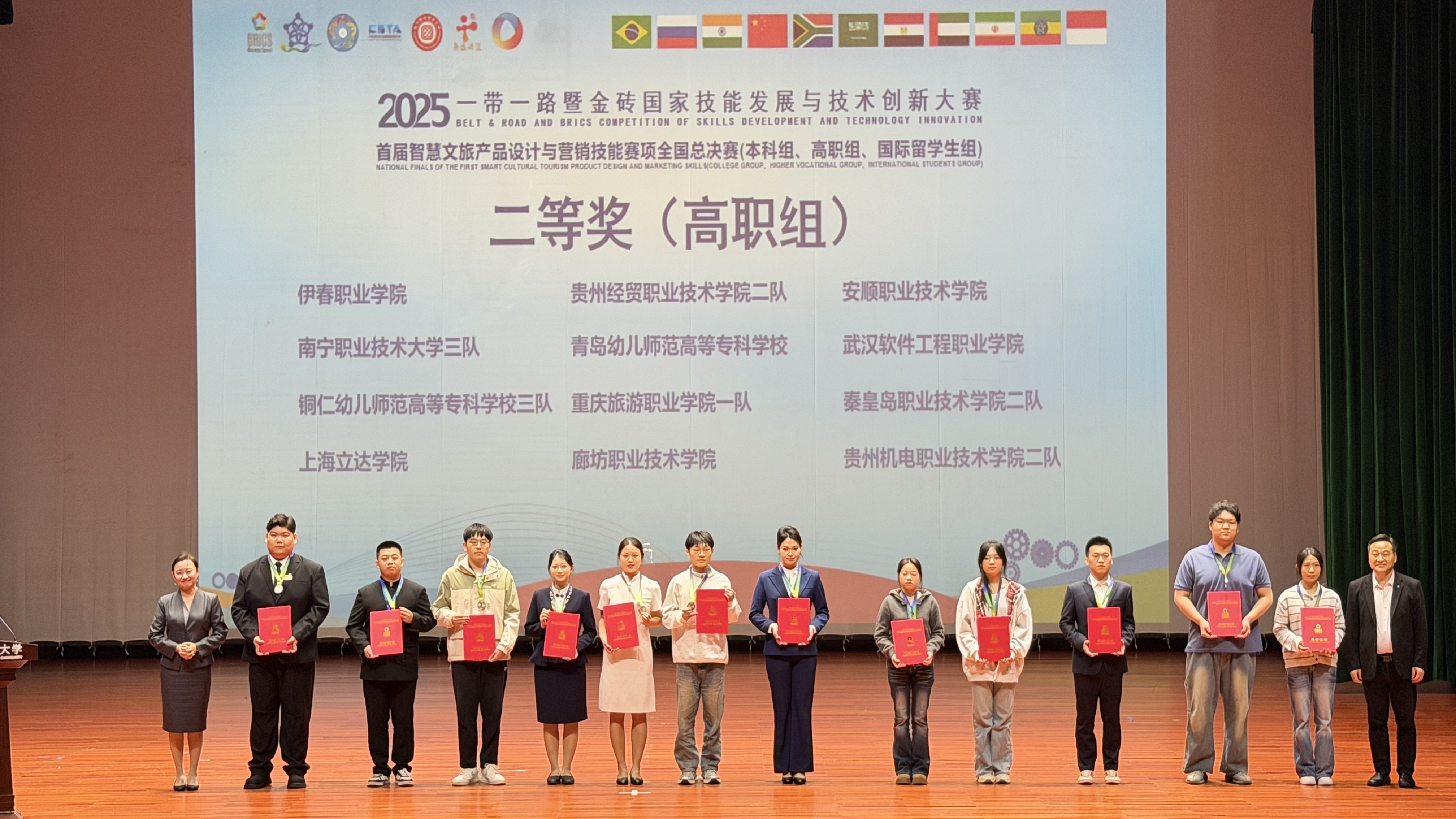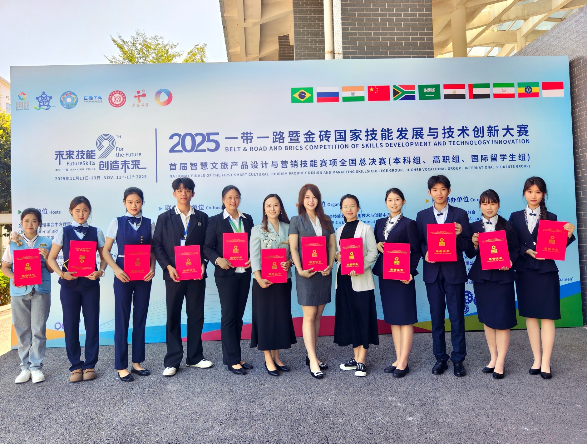 11月13日上午,2025“一带一路”暨金砖国家技能发展与技术创新大赛首届智慧文旅产品设计与营销技能赛项全国总决赛(本科组、高职组、国际留学生组)在南宁职业技术大学圆满落下帷幕。本届大赛汇聚了全国81支队伍、300余名技能精英同场竞技。在这场智慧与创意交织、技能与激情碰撞的文旅盛宴中,我校文化与旅游学院的两支参赛队伍分别斩获了一、二等奖的好成绩。