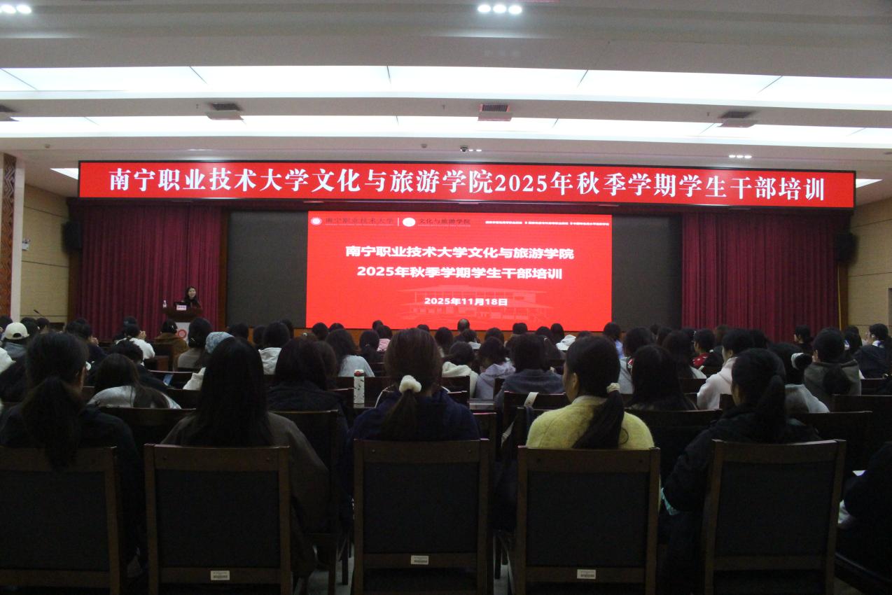 11月18日,文化与旅游学院于学校二号学术报告厅举办2025年秋季学期学生干部培训班。学院党委副书记黄全宾出席本次培训,为新任职学生干部颁发聘书,广西日报社南国早报财经新闻中心主任梁贵受邀担任主讲人,为学生干部开展专题授课。