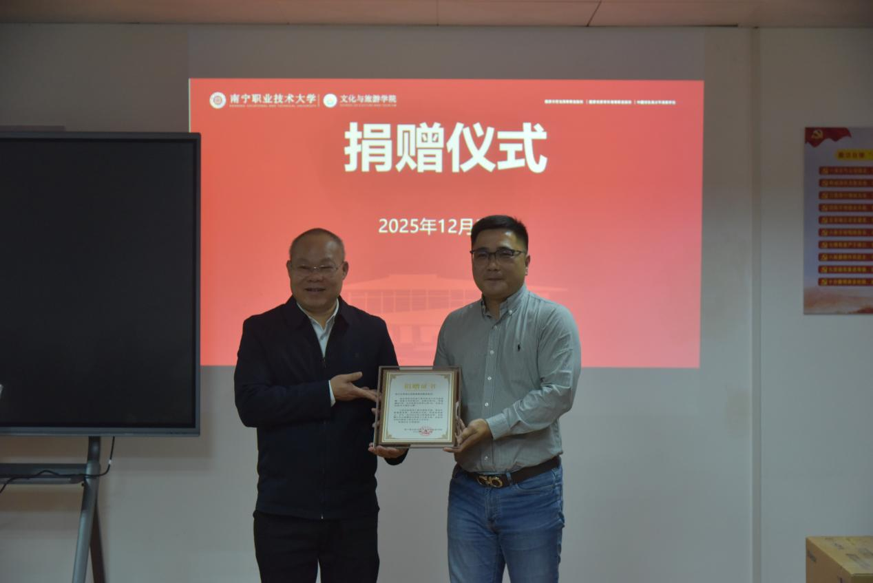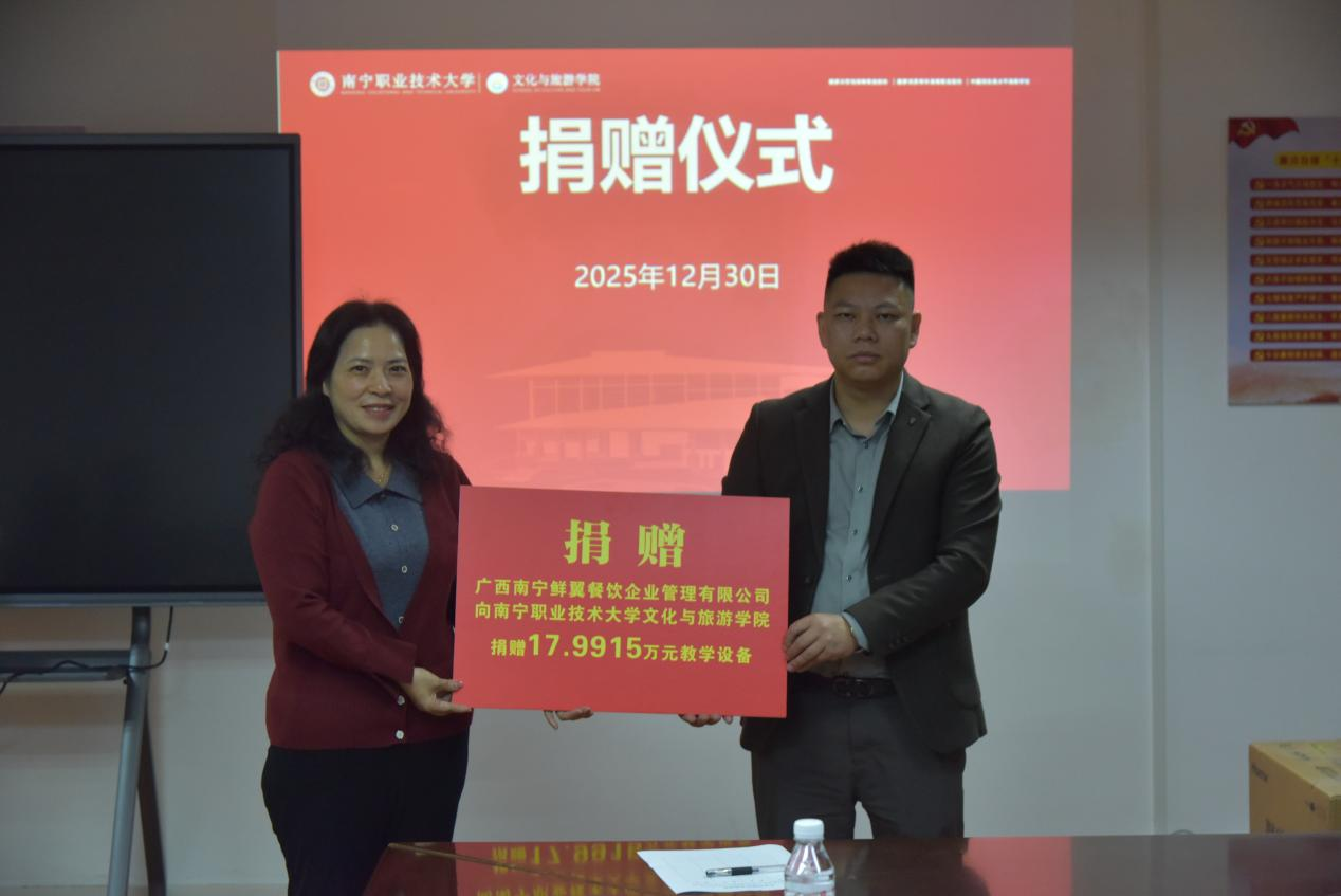 广西南宁鲜翼餐饮企业管理有限公司副总经理林世兴向文旅学院捐赠一批价值17.9915万元设备