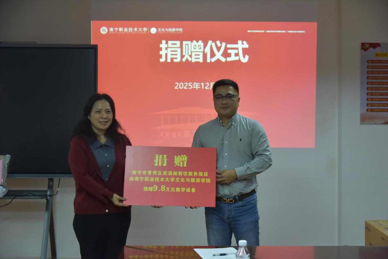南宁市青秀区思源阁餐饮服务饭店经量葛少晖向文旅学院捐赠一批价值9.8万元设备(农凯/摄)