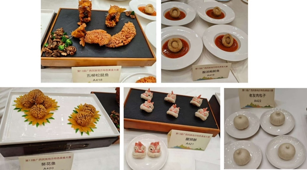 在赛事筹备中,卢睿统筹规划,将赛事作为检验教学、提升学生实践能力的契机。烹饪团队邓玮、文歧福、李星亚、刘仁、李河等教师分工协作,从菜品选题、食材筛选到工艺优化、赛前训练进行全程指导。团队秉持“扎根本土,贴合需求”理念,在传承桂菜的同时注重创新。本次大赛中,我院选手表现优异:张财标的《五丝松鼠鱼》、莫龙天的《酸汤鲍鱿鱼》、何明健的《醒狮酥》荣获特金奖;张鑫的《老友肉包子》荣获金奖;廖杰的《葵花鱼》荣获银奖。此外,菜品整体在食材与口味的多样性上契合了团体赛要求,团队最终获得了“团体特金奖”。