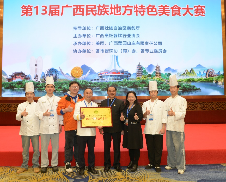 2026年1月17日,第十三届广西民族地方特色美食大赛在南宁荔园山庄国际会议中心举行。大赛由广西烹饪餐饮行业协会主办,自治区商务厅指导,并纳入商务部“中华美食荟”及自治区餐饮促消费项目,旨在弘扬广西饮食文化、建设桂菜品牌,吸引了全区众多餐饮单位、院校与从业者参与。我院组建参赛队伍代表学校出战。团队凭借扎实技艺与创新理念,在激烈竞争中脱颖而出,参赛的五款菜品共获特金奖、金奖、银奖,并斩获“团体特金奖”,充分展现了专业实践教学成效与团队素养。学院院长卢睿出席活动。