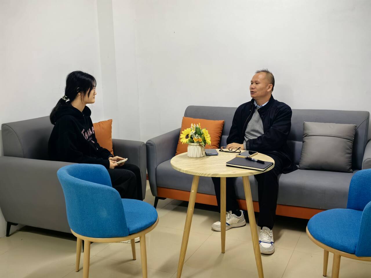黄全宾老师在“一站式”学生社区与学生谈心谈话(苏大雪/摄)