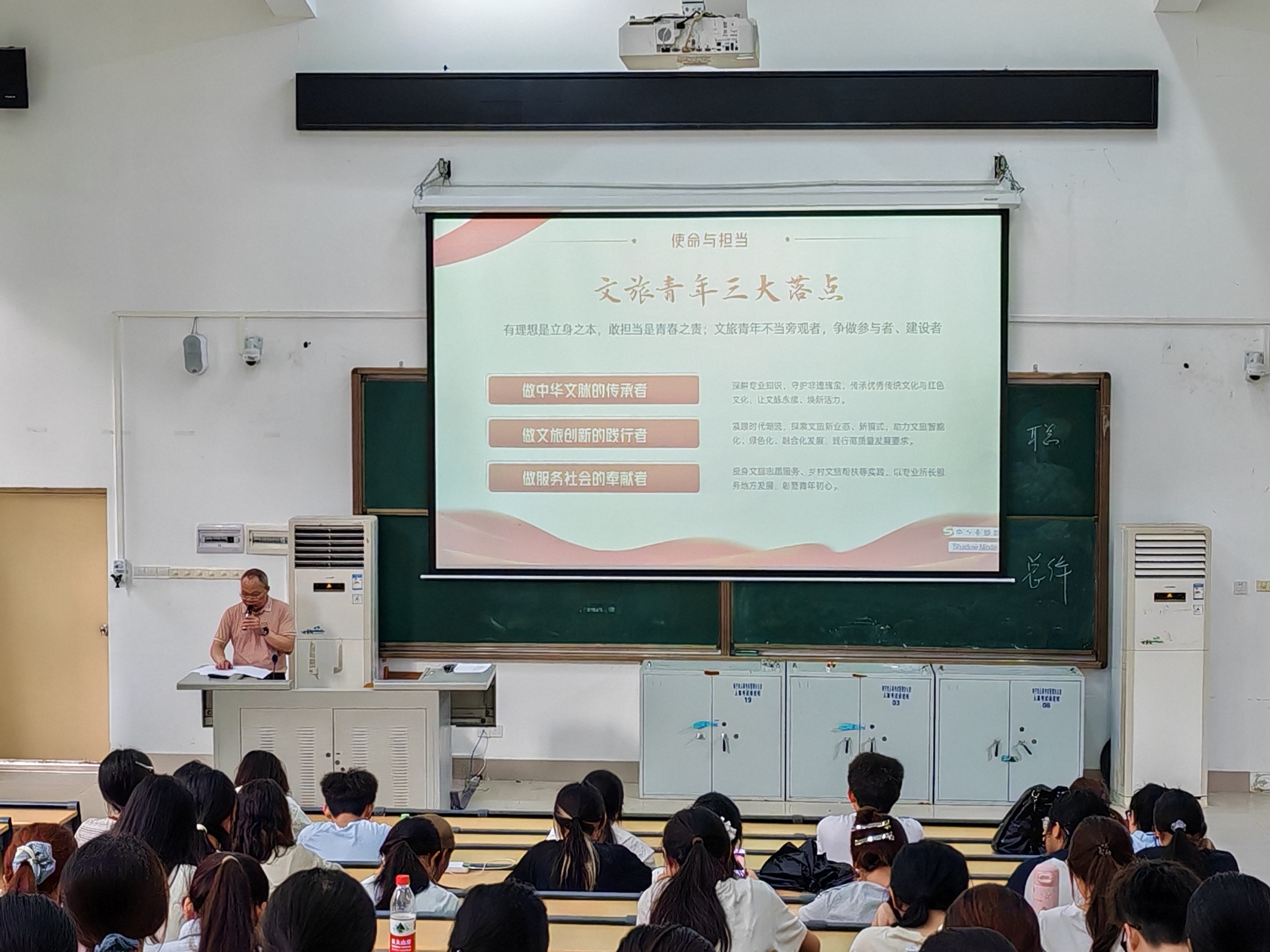 开班仪式后,陆军伟以“明确使命担当,争做有理想、敢担当的新时代青年”为题,讲授第一节专题团课,围绕理想信念、使命担当、实干践行三个方面,结合党的二十届四中全会精神与文旅发展方向,引导同学们坚定信仰、锤炼本领、勇担使命,扣好入团“第一粒扣子”。