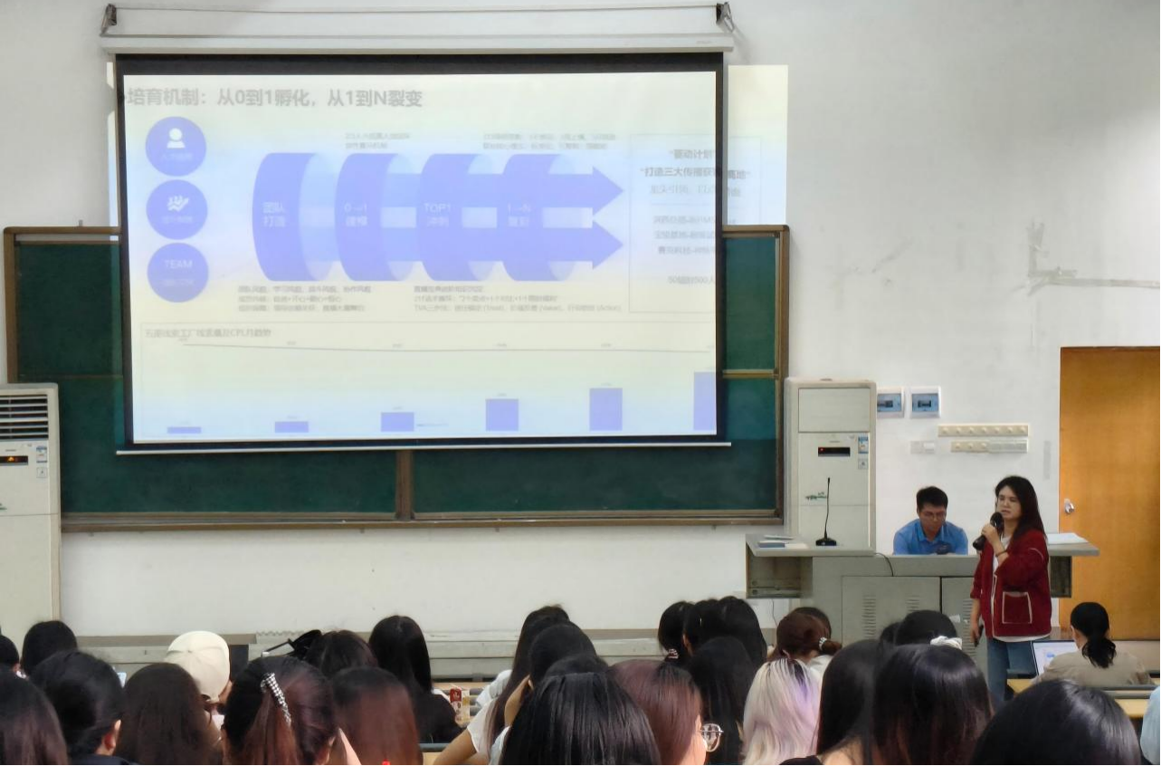 宣讲会上,上汽通用五菱人力资源部代表李林东、五菱官方新媒体中心负责人欧春黎围绕品牌发展历程、核心业务布局、新媒体中心概况进行全面介绍重点解读融媒体中心实习岗位招聘需求,岗位涵盖主播、运营、拍摄剪辑等。此外,企业还分享了新媒体运营成功案例,着重介绍为实习生搭建的大型活动执行、直播大赛等多元实践机会,帮助学生全面了解企业实习资源与发展空间,有效激发了学子应聘热情。