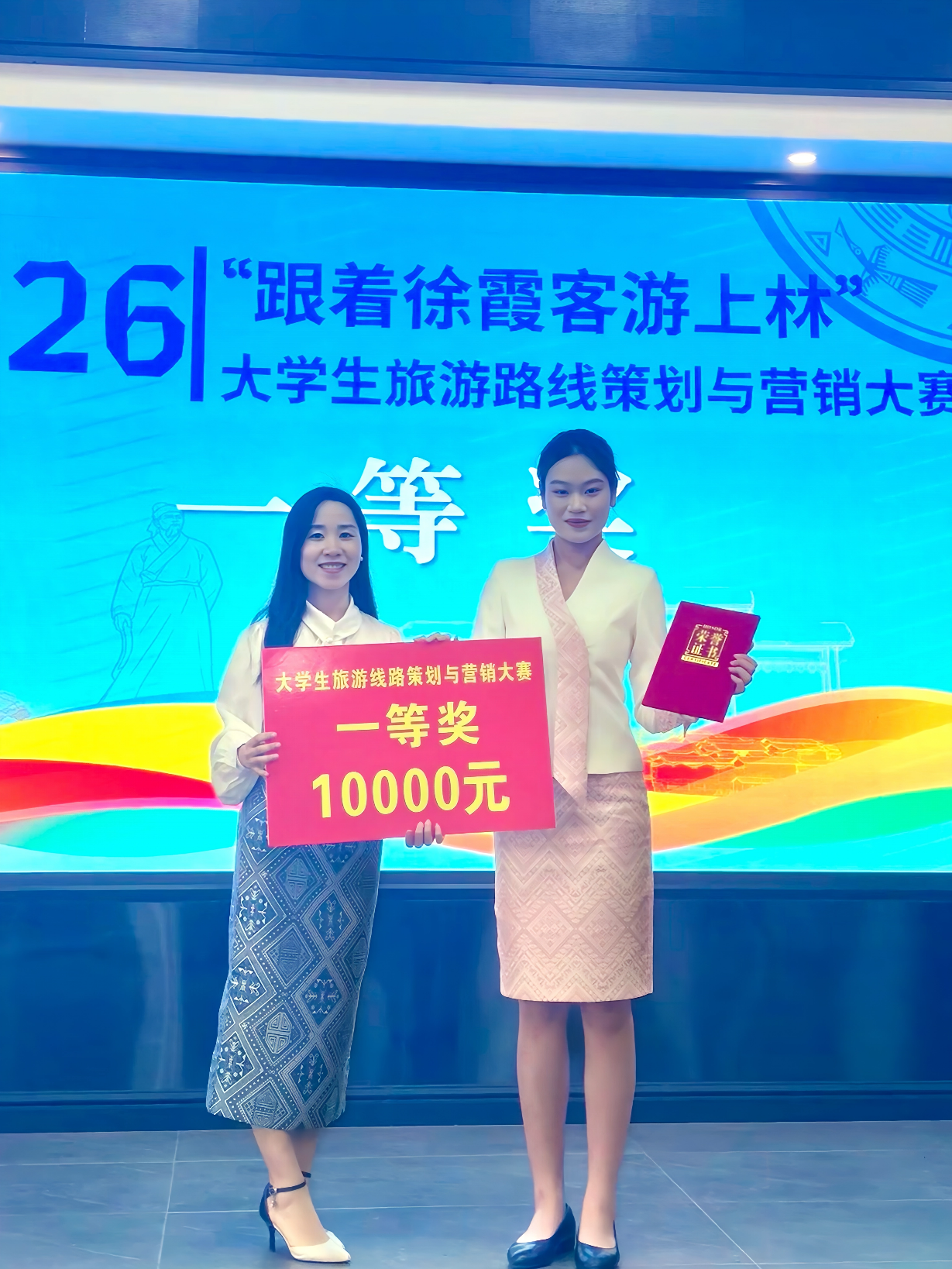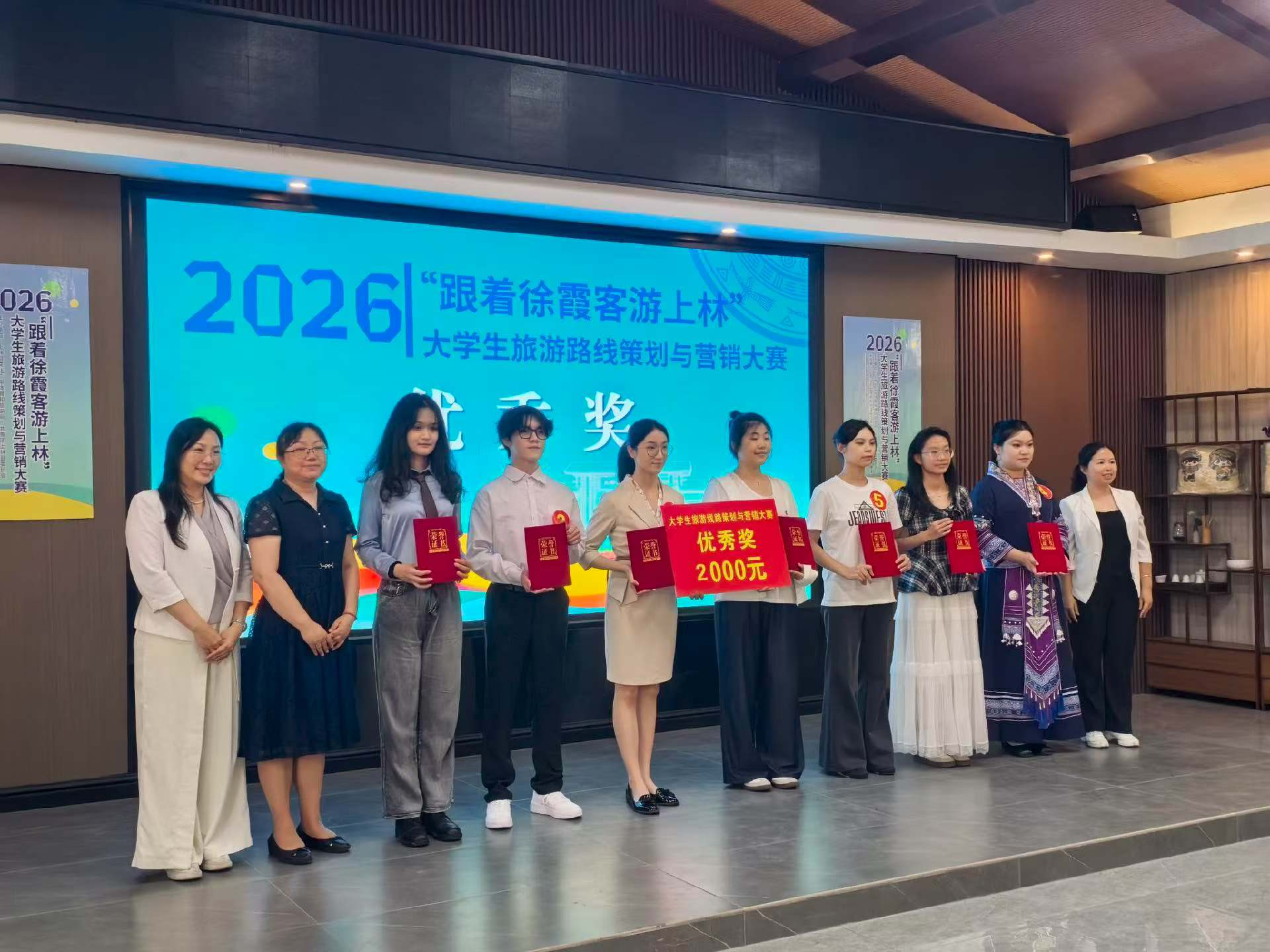 经过激烈角逐,由林筱筠老师指导,张冰冰、黄智灵、黄祉祎策划的作品——“霞客”行,上林沉浸式剧本游立意新颖、方案详实、落地性强,荣获大赛一等奖,斩获奖金10000元。同时,林筱筠老师指导的韦智煜、张琳娜、张世烽组,李想老师指导的陈悦、林义婵、覃沣茹、纪婷组两支队伍表现稳健,分别荣获大赛优秀奖,各获得奖金2000元。
