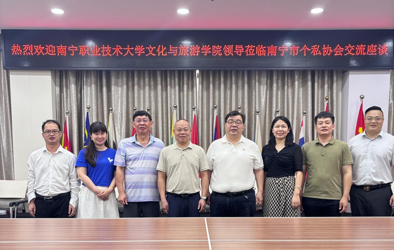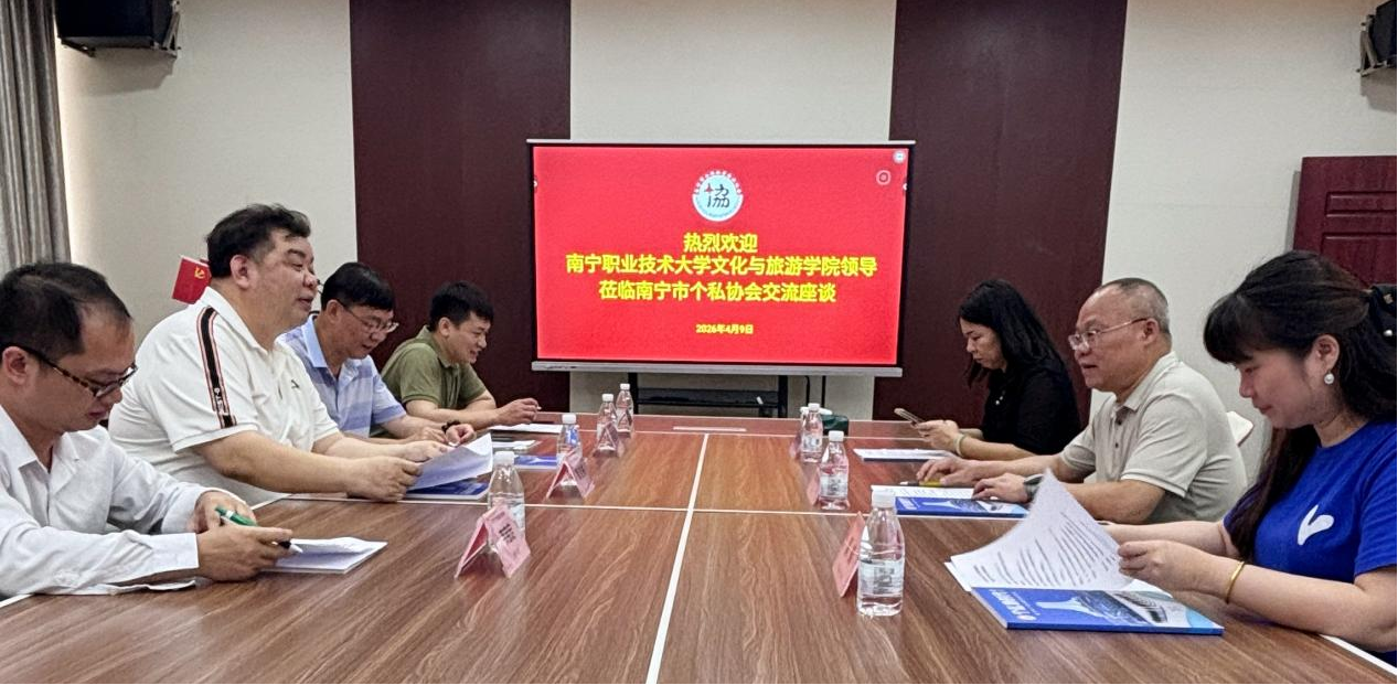 为进一步深化产教融合,推动校企协同育人,近日,南宁职业技术大学文化与旅游学院党委书记陆军伟、副院长袁榕、传播与策划专业带头人莫锦一行赴南宁个体私营企业协会开展校企合作交流。协会党总支书记、会长覃启站,秘书长范江,常务副会长、广西智创鼎峰科技有限公司董事长韦宝定及总经理梁云迪热情接待并参与座谈。