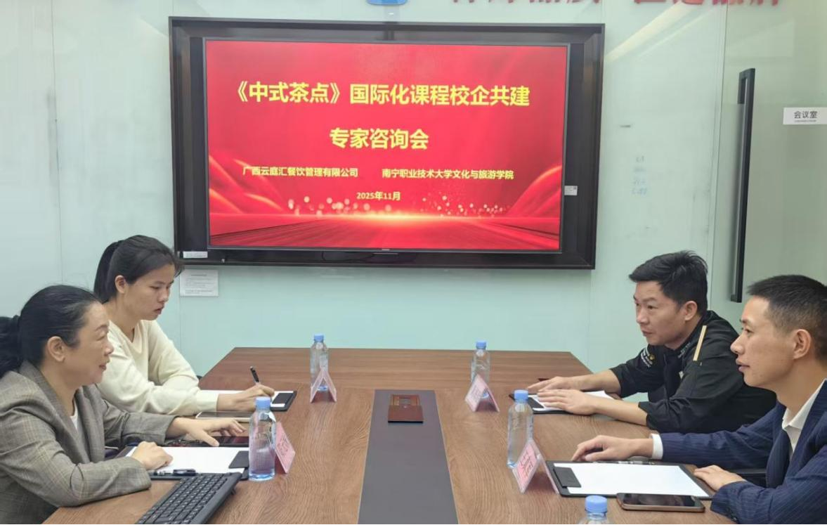 2025年11月13日,文化与旅游学院《中式茶点》国际化课程建设负责人阳元妹老师和课程建设主要成员零焕老师一起赴广西云庭汇餐饮管理有限公司参加该课程校企共建专家咨询会,与企业运营总监王真军、点心主管黄海胜大师和人事行政经理张新梅一起就《中式茶点》课程校企共建的目的、内容、方式和意义等方面进行了充分地交流和沟通。课程校企共建一方面可以将企业文化、理念和技艺融入校内的教学,促进教学企业化,另一方面可以让学...