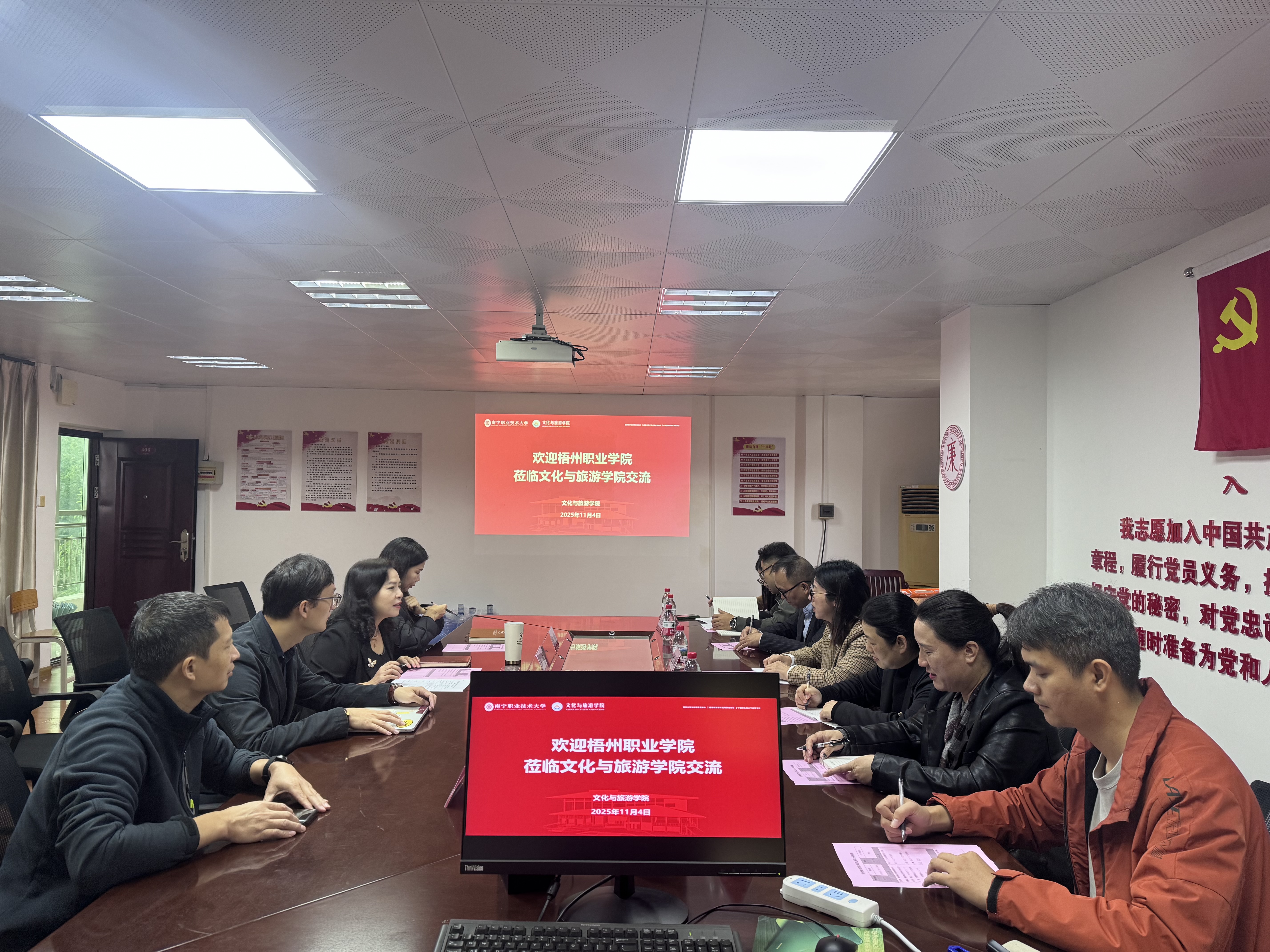 11月4日上午,梧州职业学院商学院院长莫永然带队到我院交流。学院院长卢睿、副院长袁榕等参加交流座谈会。卢睿首先对梧州职业学院商学院院长莫永然一行来访表示热烈欢迎,并介绍了学院办学历史与专业建设等情况;莫永然介绍了商学院的基本情况及交流考察的主要目的。双方围绕人才培养方案、数字化课程体系设计、技能大赛训练及数字化实训室建设等方面进行了深入探讨。座谈会现场(梁佳妮/摄)供 稿:文化与旅游学院 方 堃一审...